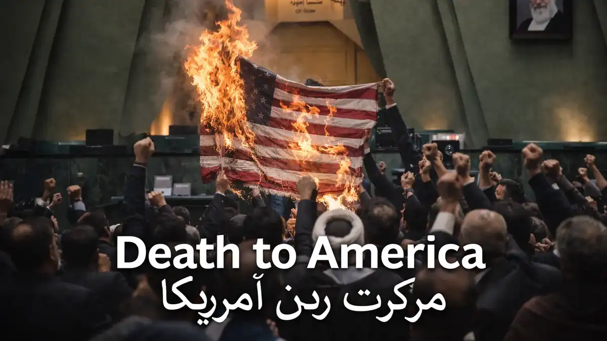 Το πρώτο ασφαλές συμπέρασμα είναι ότι το κάψιμο της αμερικανικής σημαίας και το σύνθημα «Θάνατος στην Αμερική» έχουν πράγματι καταγραφεί στη Βουλή και σε κρατικά ή ημικρατικά οργανωμένες κινητοποιήσεις στο Ιράν. Δεν είναι fabricated σκηνές. Είναι πραγματικό μέρος της καθεστωτικής πολιτικής γλώσσας.