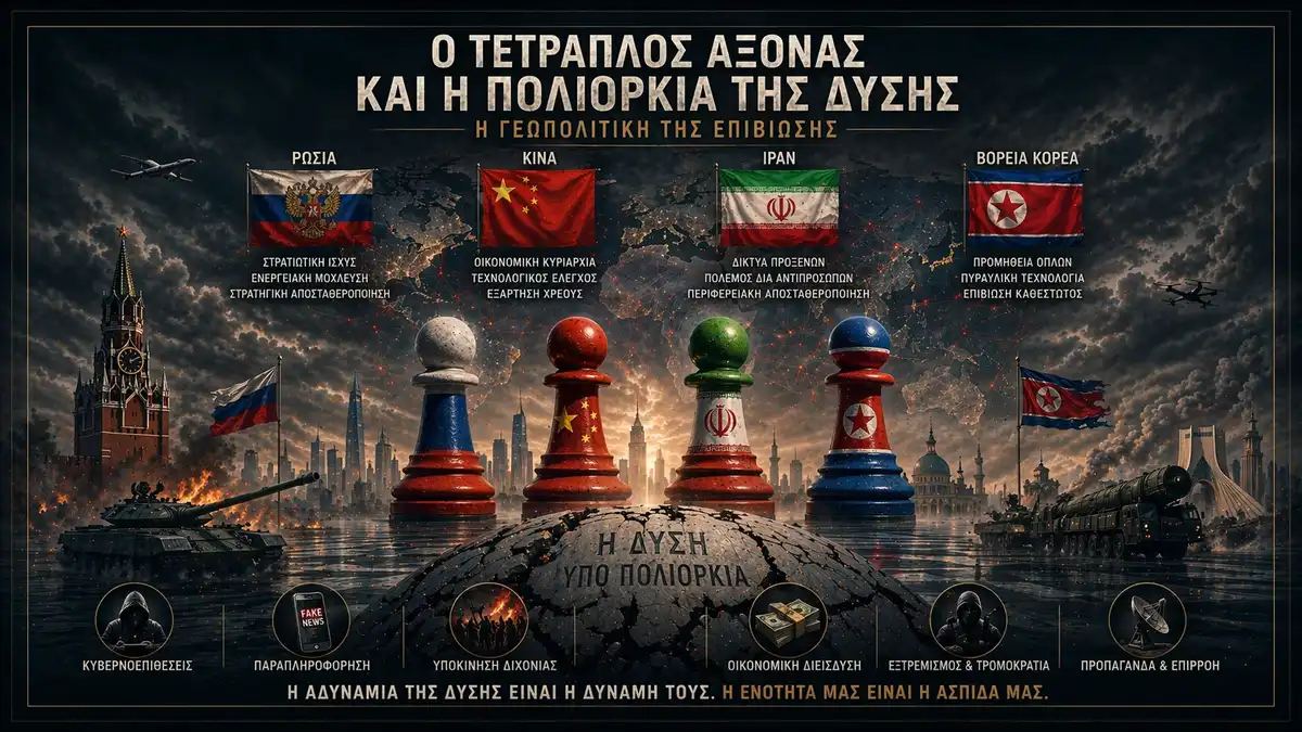 Το πιο επικίνδυνο ίσως στοιχείο αυτού του τετραπλού άξονα δεν είναι μόνο τα όπλα, τα πλοία, τα drones ή τα πυραυλικά τεστ. Είναι η δυνατότητα να πολιορκεί τη Δύση εκ των έσω.